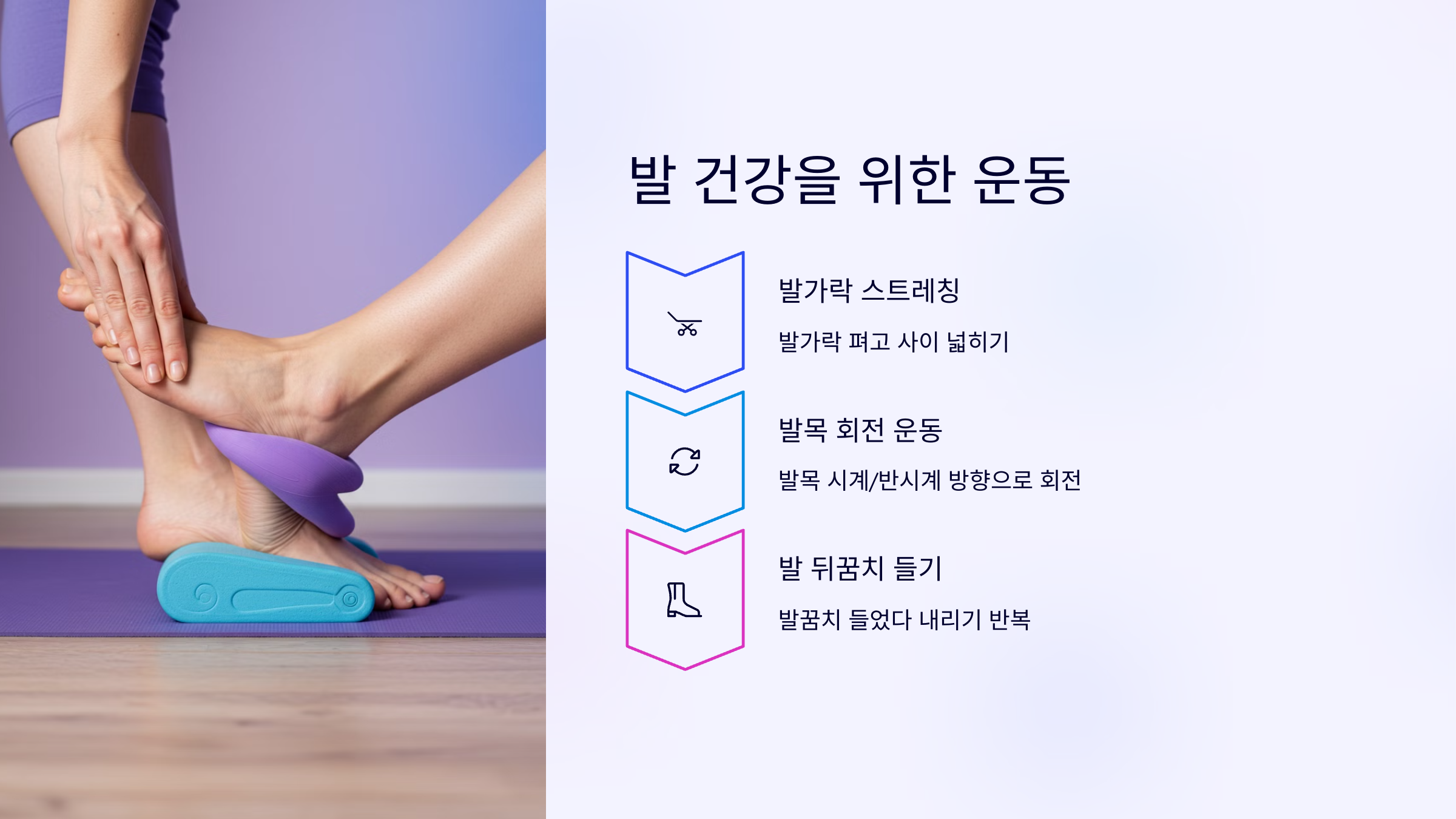 발 건강을 유지하기 위해 다양한 운동을 할 수 있습니다. 여기에는 발 근육을 강화하고, 유연성을 향상시킬 수 있는 운동들이 포함됩니다.