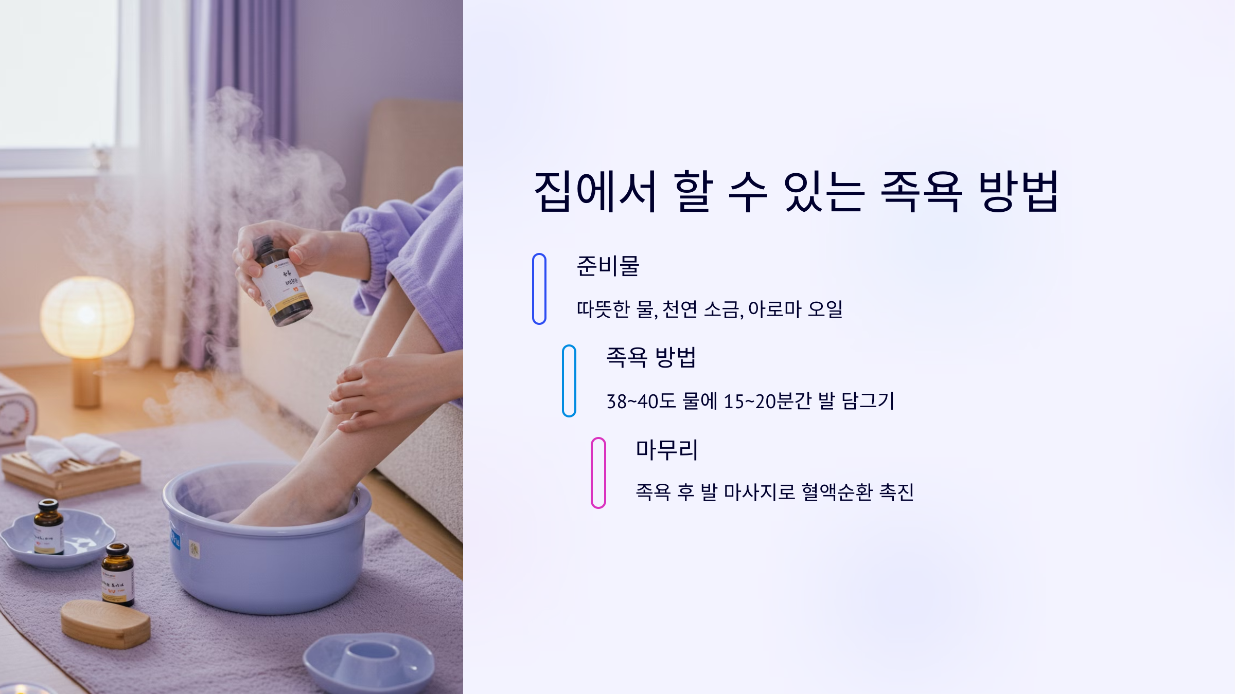 족욕은 발을 건강하게 유지하는 데 매우 효과적인 방법입니다. 집에서 쉽게 할 수 있는 족욕 방법을 소개합니다.