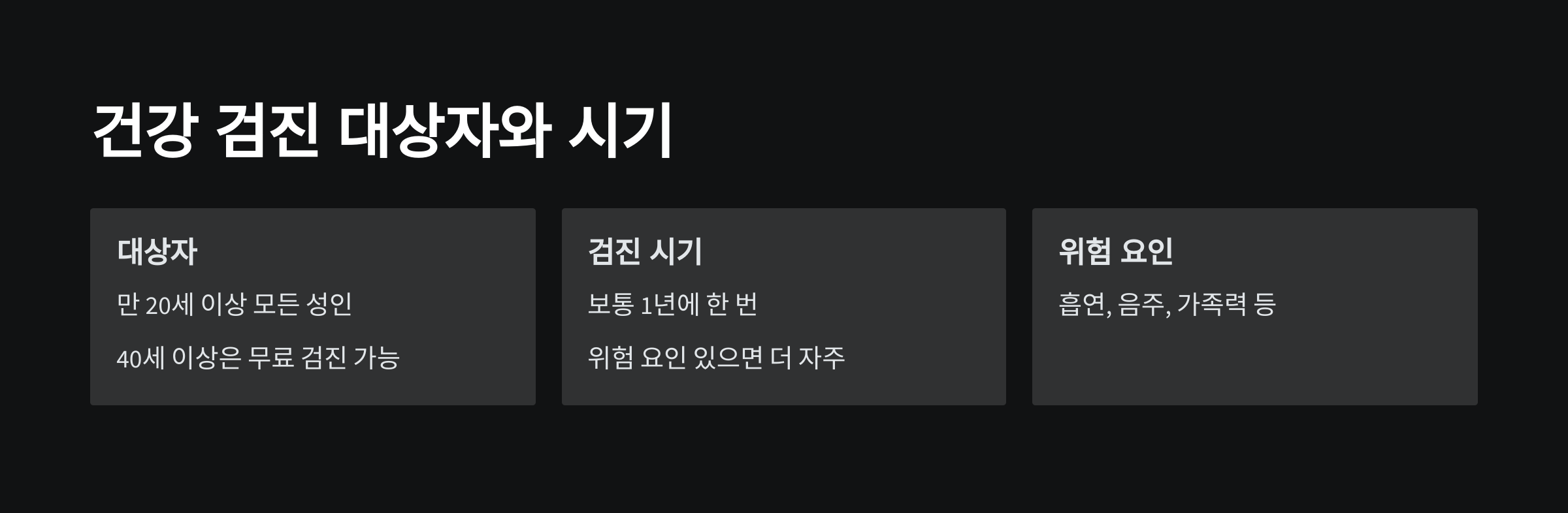 - 검진 시기: 보통 1년에 한 번 검진을 받는 것이 좋습니다. 그러나 위험 요인(흡연, 음주, 가족력 등)이 있는 경우 더 자주 검진을 받을 수 있습니다.