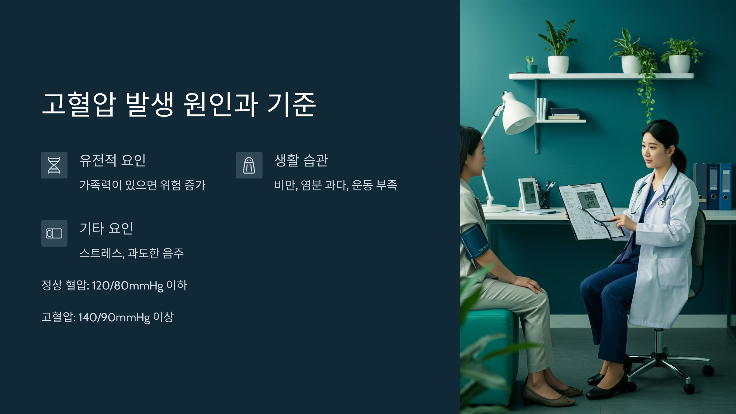 고혈압은 다양한 원인에 의해 발생할 수 있습니다. 대표적으로 유전적 요인, 나이, 비만, 스트레스, 과도한 음주, 염분 과다 섭취, 운동 부족 등이 원인으로 꼽힙니다. 특히, 유전적 요인이 중요한 역할을 하며, 부모나 가족 중에 고혈압이 있는 경우 고혈압에 걸릴 위험이 높습니다. 또한, 나이가 들수록 혈관이 경직되고 탄력이 떨어지면서 고혈압이 발생할 가능성이 커집니다.