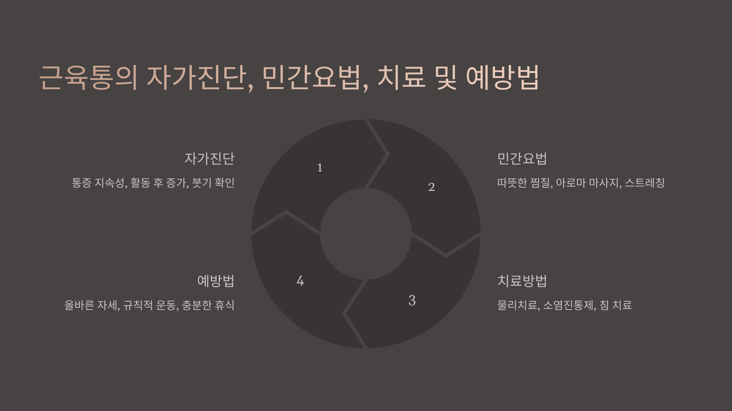 근육통은 일상생활에서 누구나 한 번쯤 겪는 흔한 증상이지만, 원인을 알고 적절히 관리하면 충분히 예방하고 완화할 수 있습니다. 건강한 자세와 꾸준한 운동, 충분한 휴식을 통해 근육 건강을 유지하는 것이 중요합니다. 작은 통증도 방치하지 말고 조기에 관리하여 더욱 건강한 생활을 유지합시다!