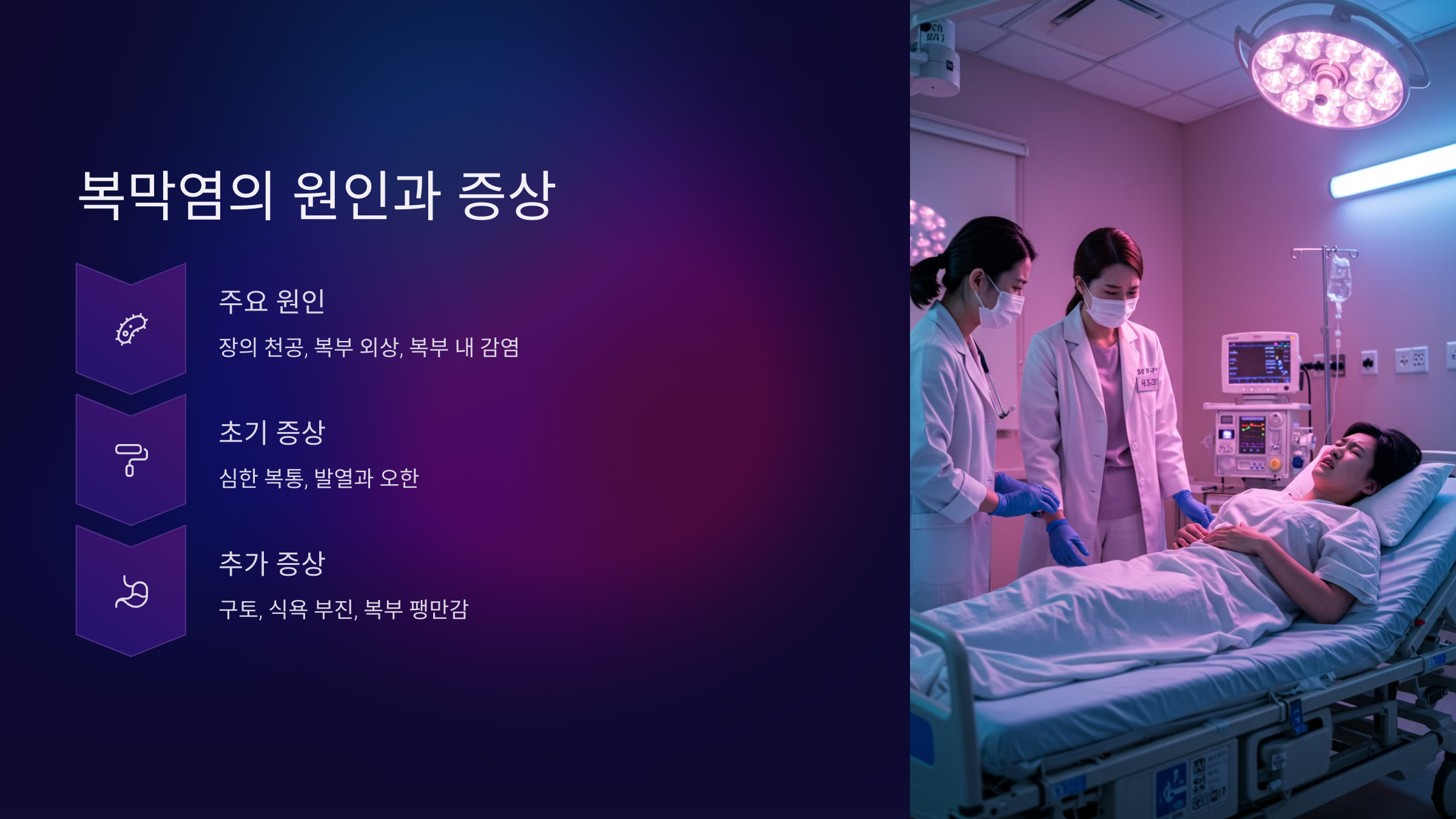 복막염은 빠르게 진행되는 질환으로, 증상이 나타나면 즉시 의사의 진료를 받는 것이 중요합니다. 조기에 치료하지 않으면 생명에 지장을 줄 수 있습니다.