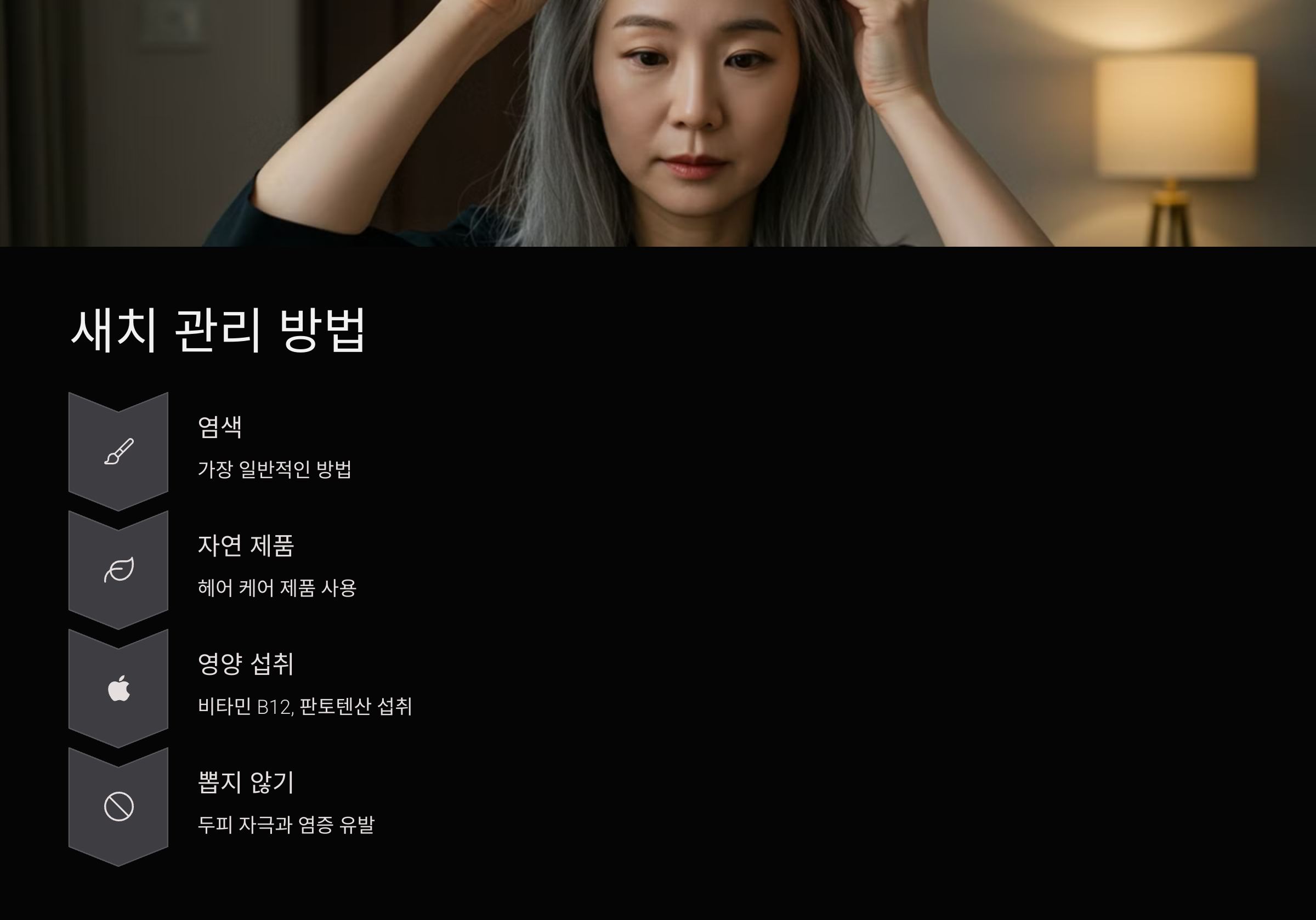 새치가 생겼을 때 가장 많이 선택하는 방법은 염색입니다. 하지만 염색은 시간이 지나면서 반복적으로 해야 하며, 두피나 머리카락에 자극을 줄 수 있습니다. 최근에는 새치를 자연스럽게 처리할 수 있는 헤어 케어 제품들이 출시되고 있으며, 비타민 B12나 판토텐산 등 멜라닌 합성을 촉진하는 성분이 포함된 제품들이 도움이 될 수 있습니다. 그러나 새치가 생기지 않도록 예방하는 치료법은 아직 과학적으로 확립된 것은 없습니다.