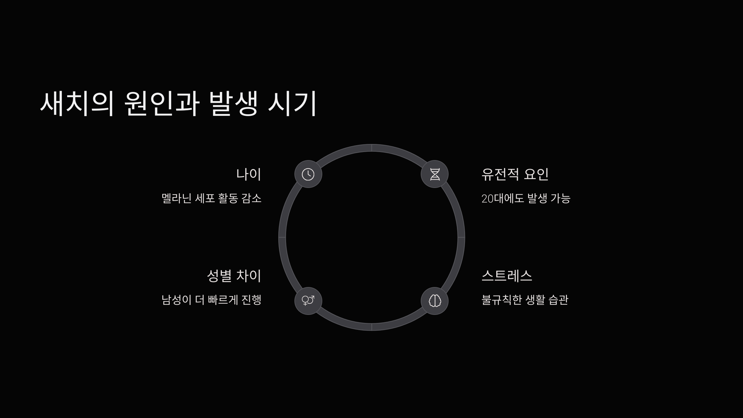 새치는 머리카락을 구성하는 멜라닌 색소의 생산이 감소하면서 발생합니다. 즉, 머리카락이 자라면서 멜라닌 색소가 줄어들어 흰색으로 변하게 되죠.