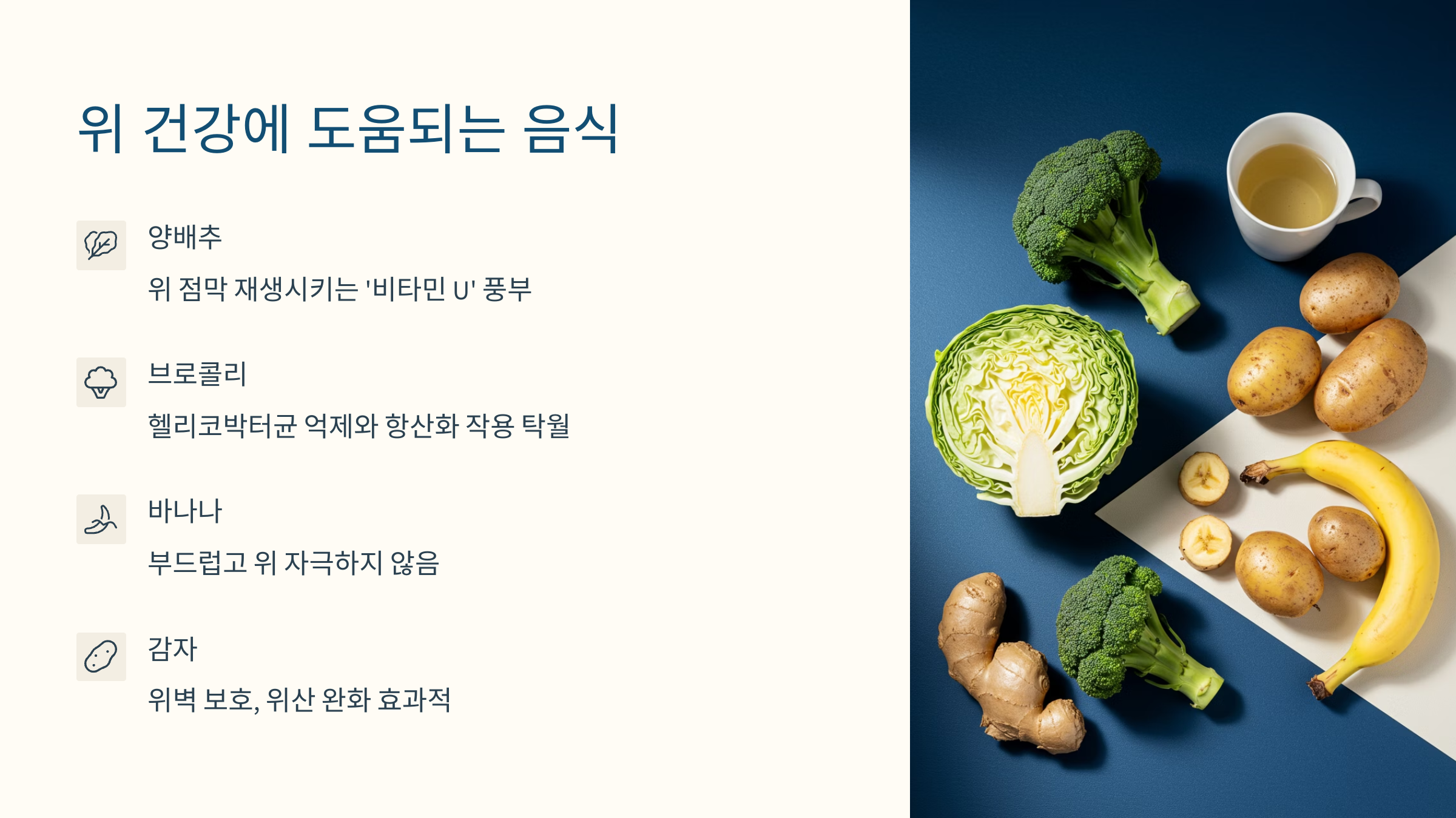 • 감자 – 위벽을 부드럽게 보호하며 위산 완화에 효과적입니다.