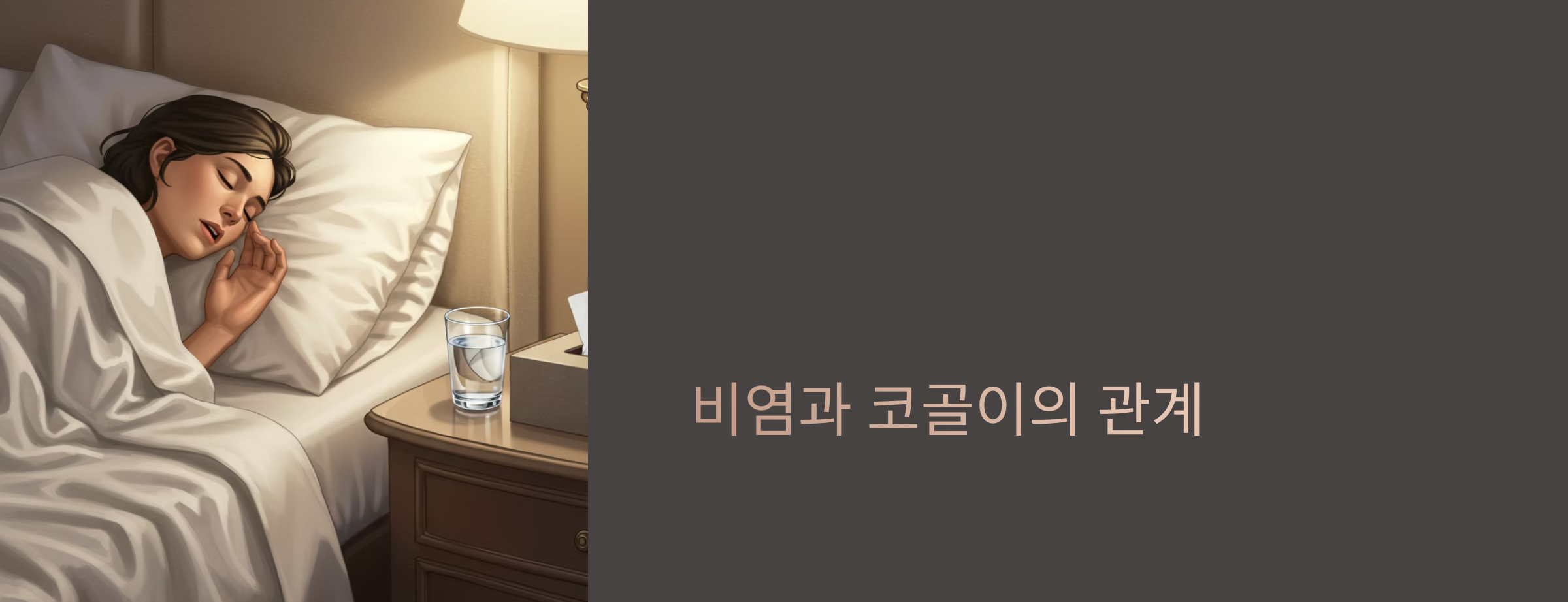 비염이 있으면 코 내부가 붓고 점액이 많아져 기도(숨길)가 좁아지게 됩니다. 그러면 공기 흐름이 불안정해지고, 수면 중 입으로 호흡하면서 혀와 연구개가 진동하면서 코골이 소리가 발생합니다.