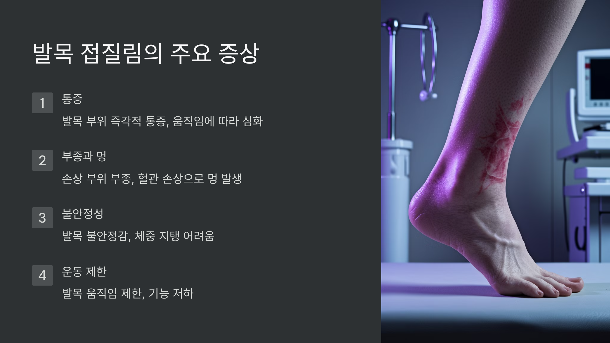 - 발목 불안정성: 발목이 불안정하게 느껴지며, 걷거나 서는 것이 어려울 수 있습니다.