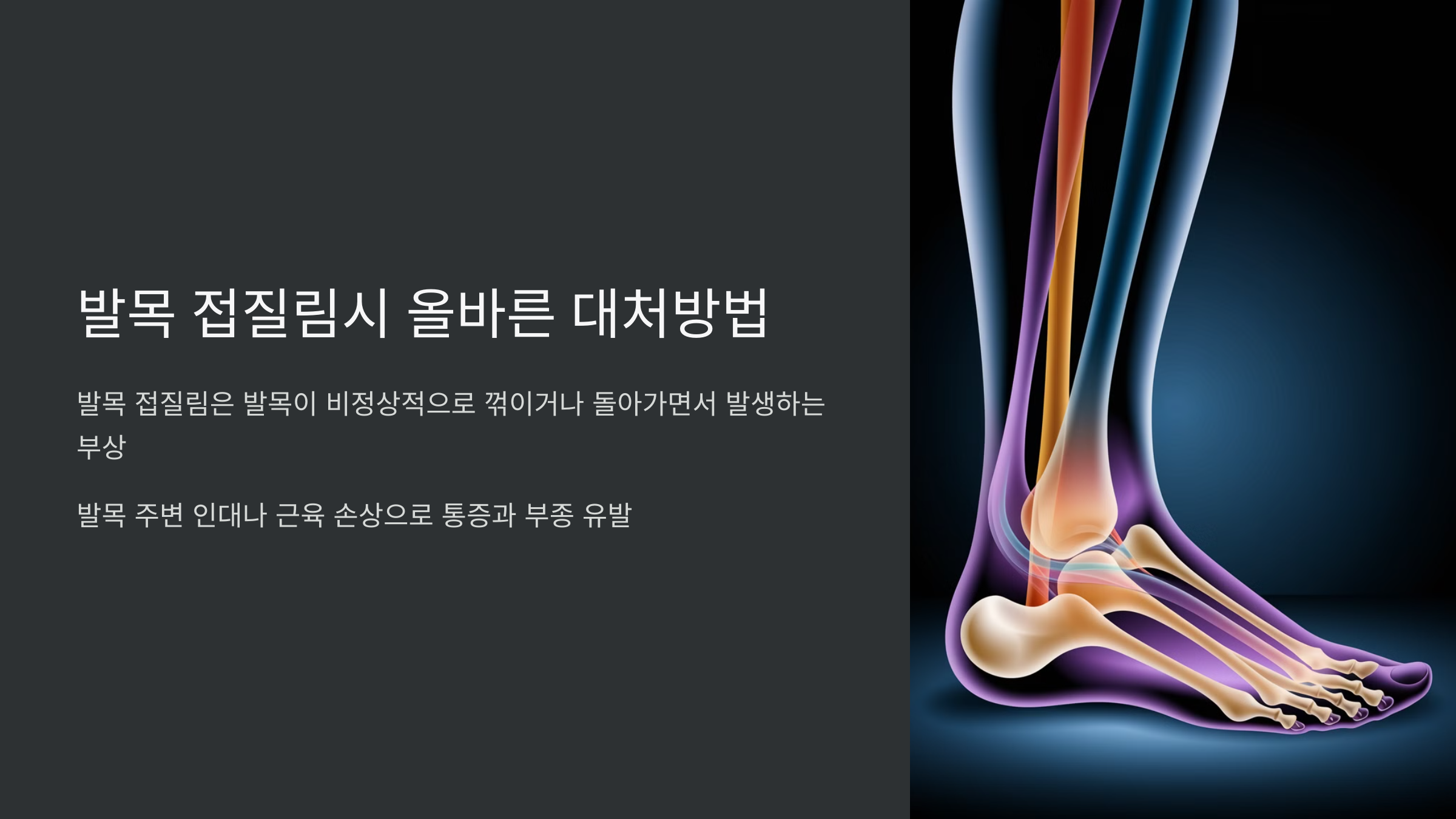 발목 접질림은 일상생활이나 운동 중 발목이 비정상적으로 꺾이거나 돌아가면서 발생하는 부상을 말합니다. 이는 발목 주변의 인대나 근육에 손상을 일으켜 통증과 부종을 유발합니다.