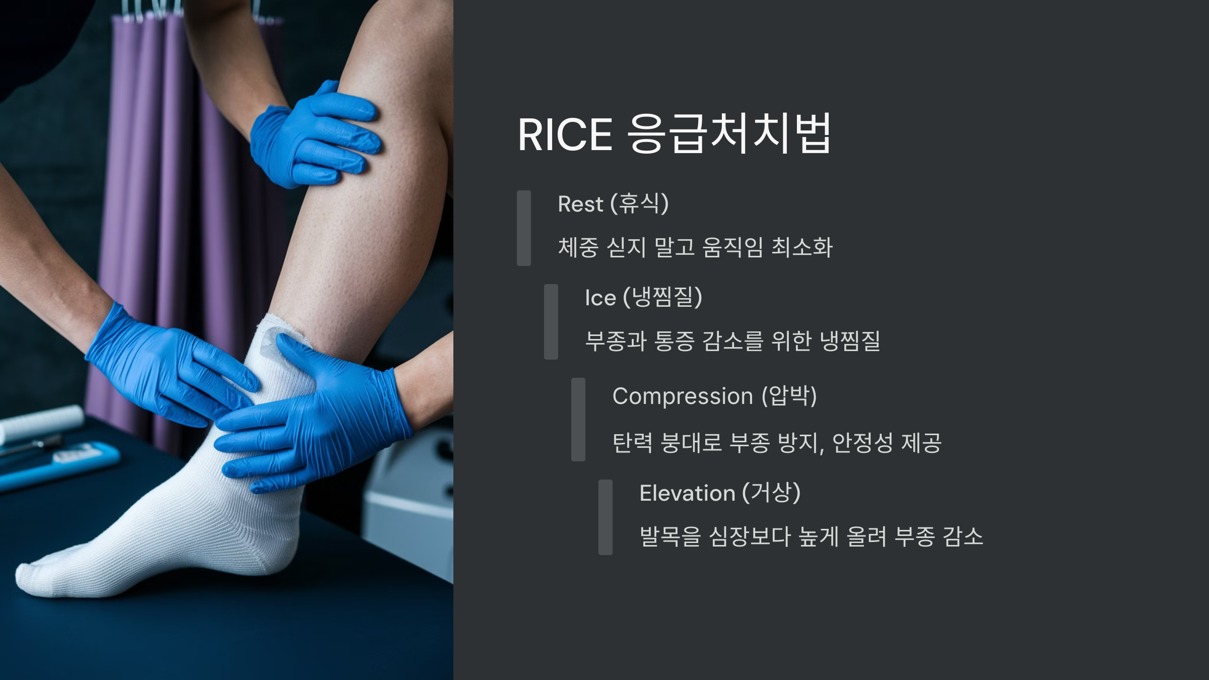 - Elevation (거상): 손상 부위를 심장보다 높게 올려 부종을 줄이고 혈액 순환을 돕습니다.