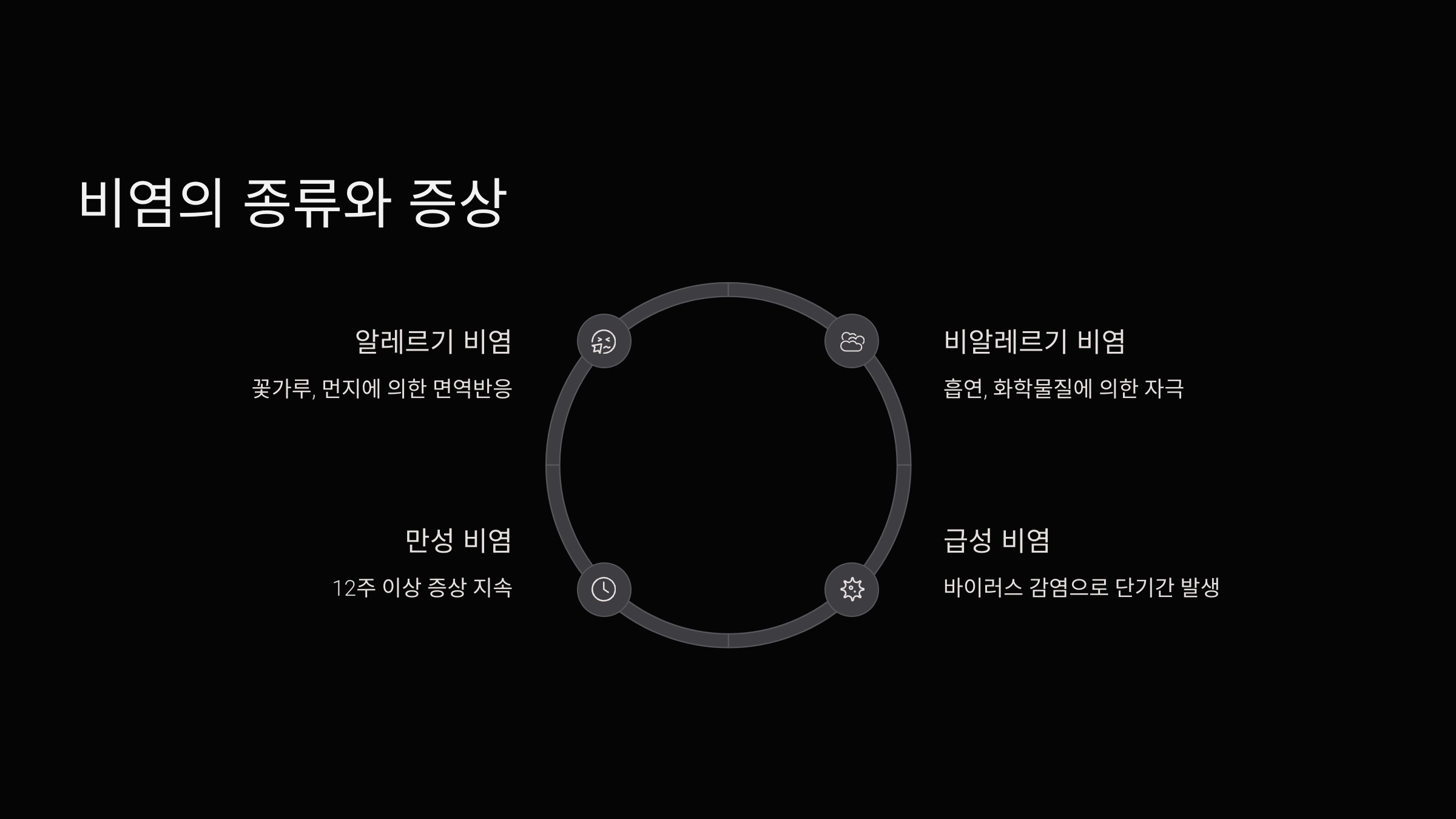 • 주요 증상: 코막힘, 콧물, 후비루(목 뒤로 내려가는 콧물), 기침.