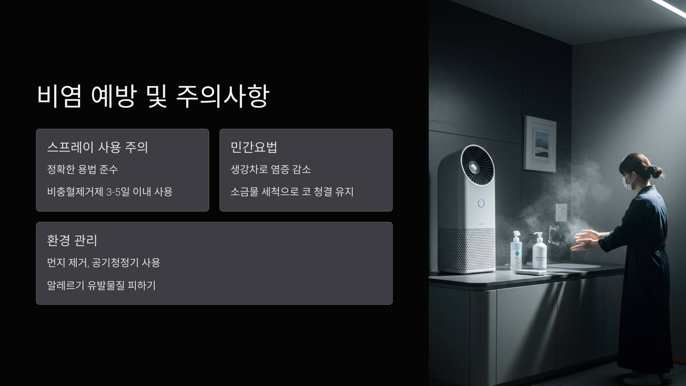 • 과용을 피하세요: 특히 비충혈제거제 스프레이는 과용 시 반동성 비염이 발생할 수 있어, 사용 기간을 3~5일 이내로 제한하는 것이 좋습니다.