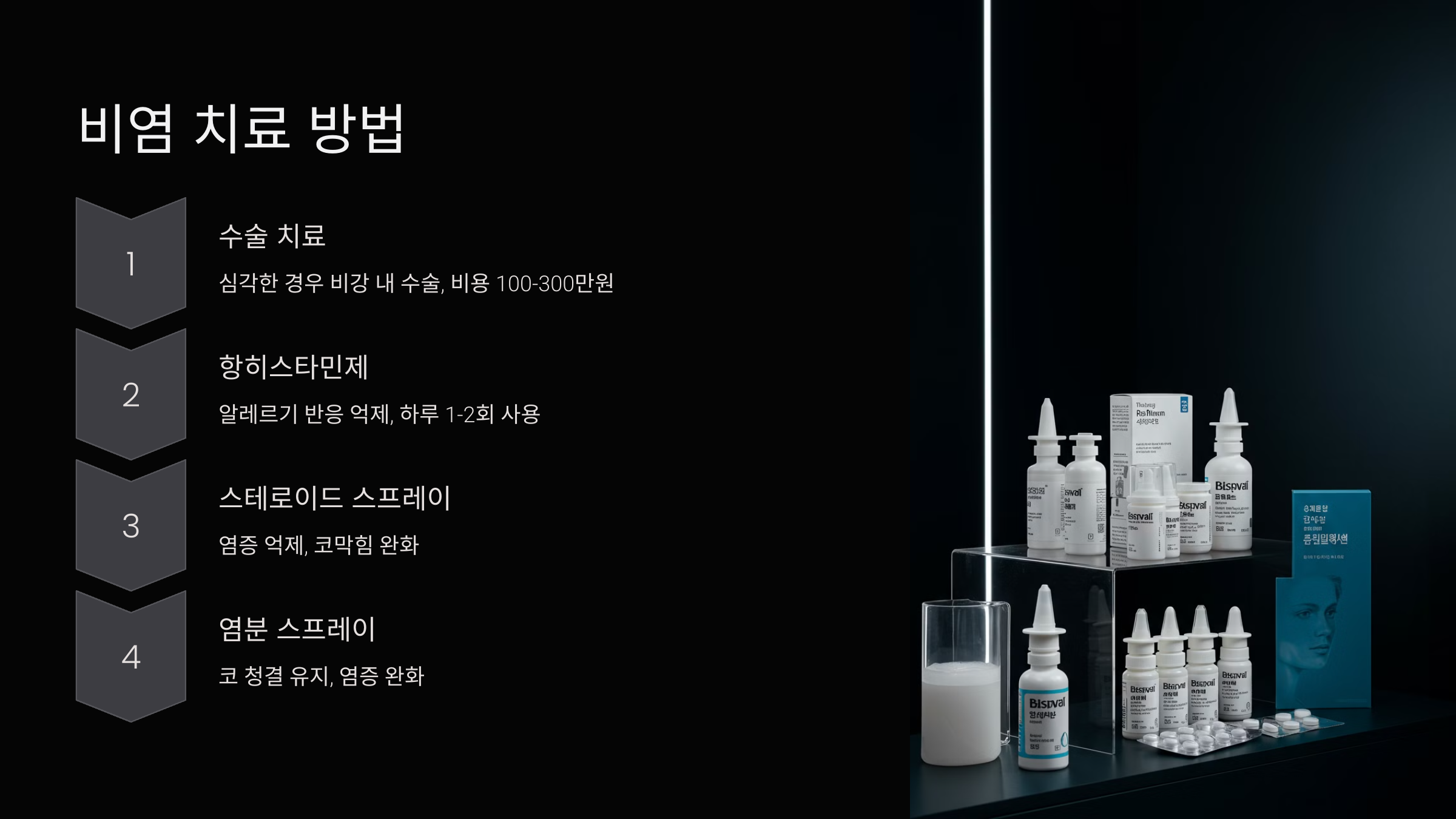 수술은 비염이 매우 심각하거나 다른 치료 방법으로 개선되지 않을 경우 고려될 수 있습니다. 대표적인 수술 방법으로는 비염 수술(비강 내 수술)이나 부비동 수술이 있습니다.