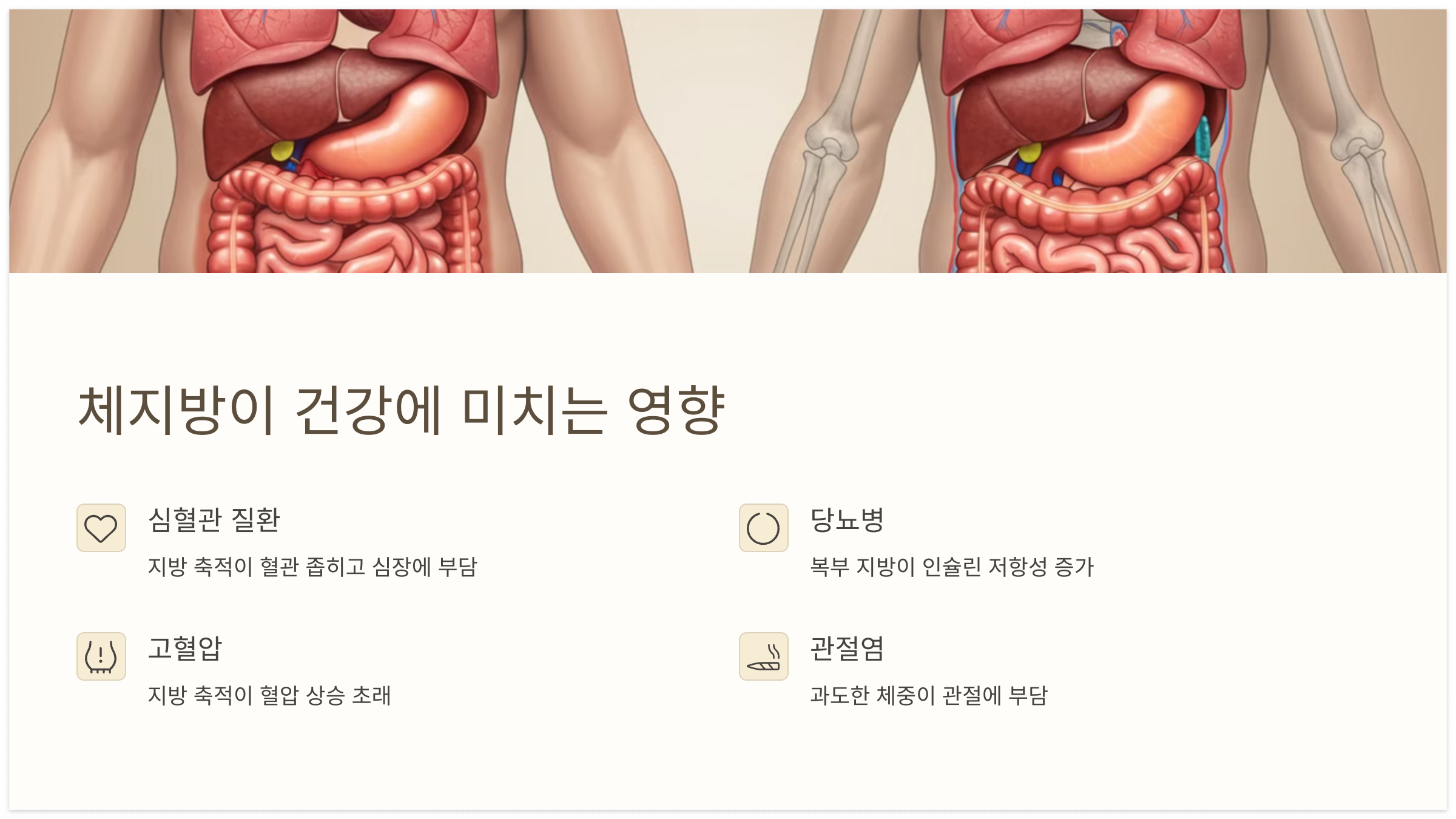 - 심혈관 질환: 체내 지방 축적이 혈관을 좁히고, 심장에 부담을 줍니다.