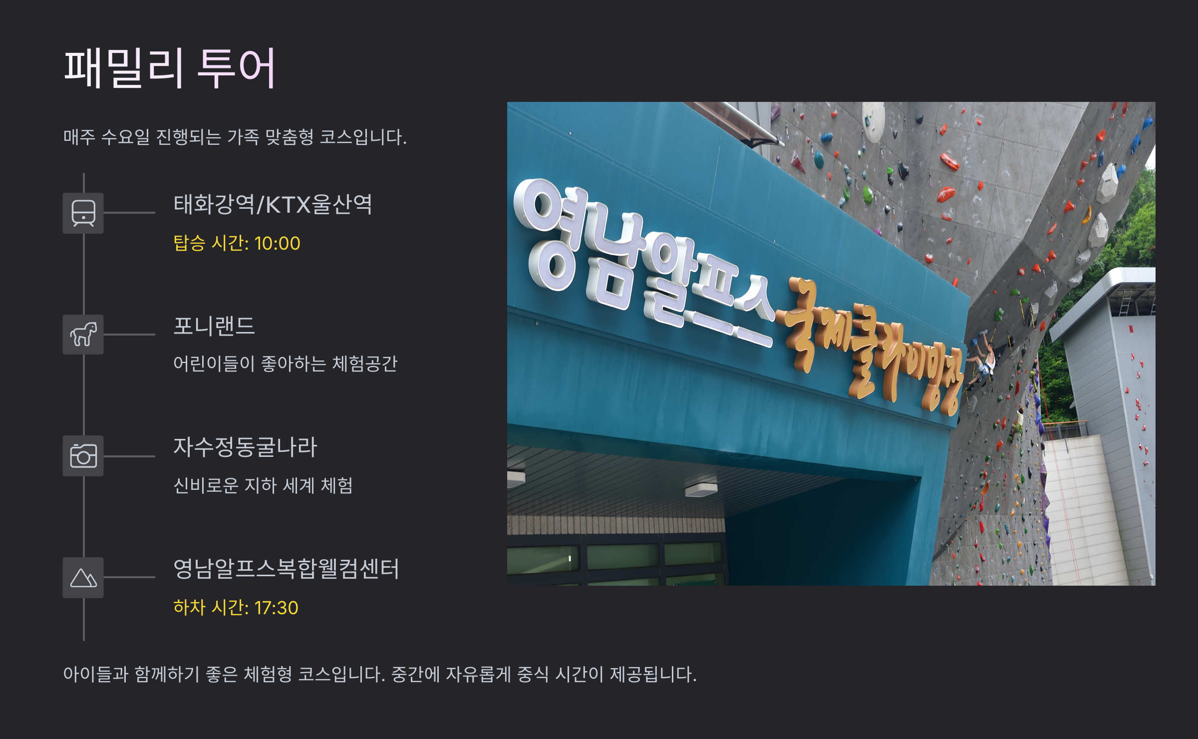 2-1.패밀리 투어 (수요일): 포니랜드, 자수정동굴나라, 영남알프스복합웰컴센터 등을 방문합니다.