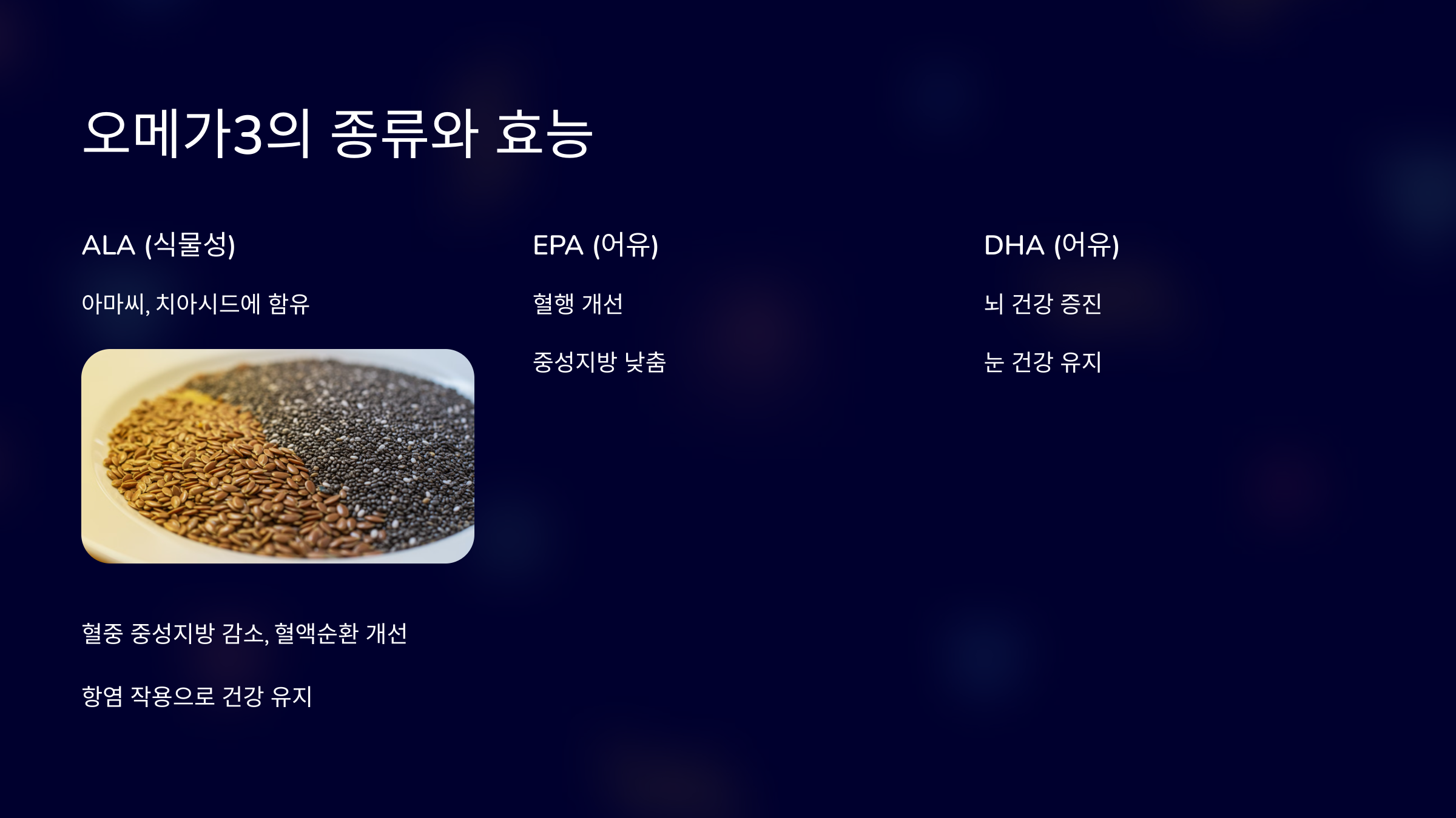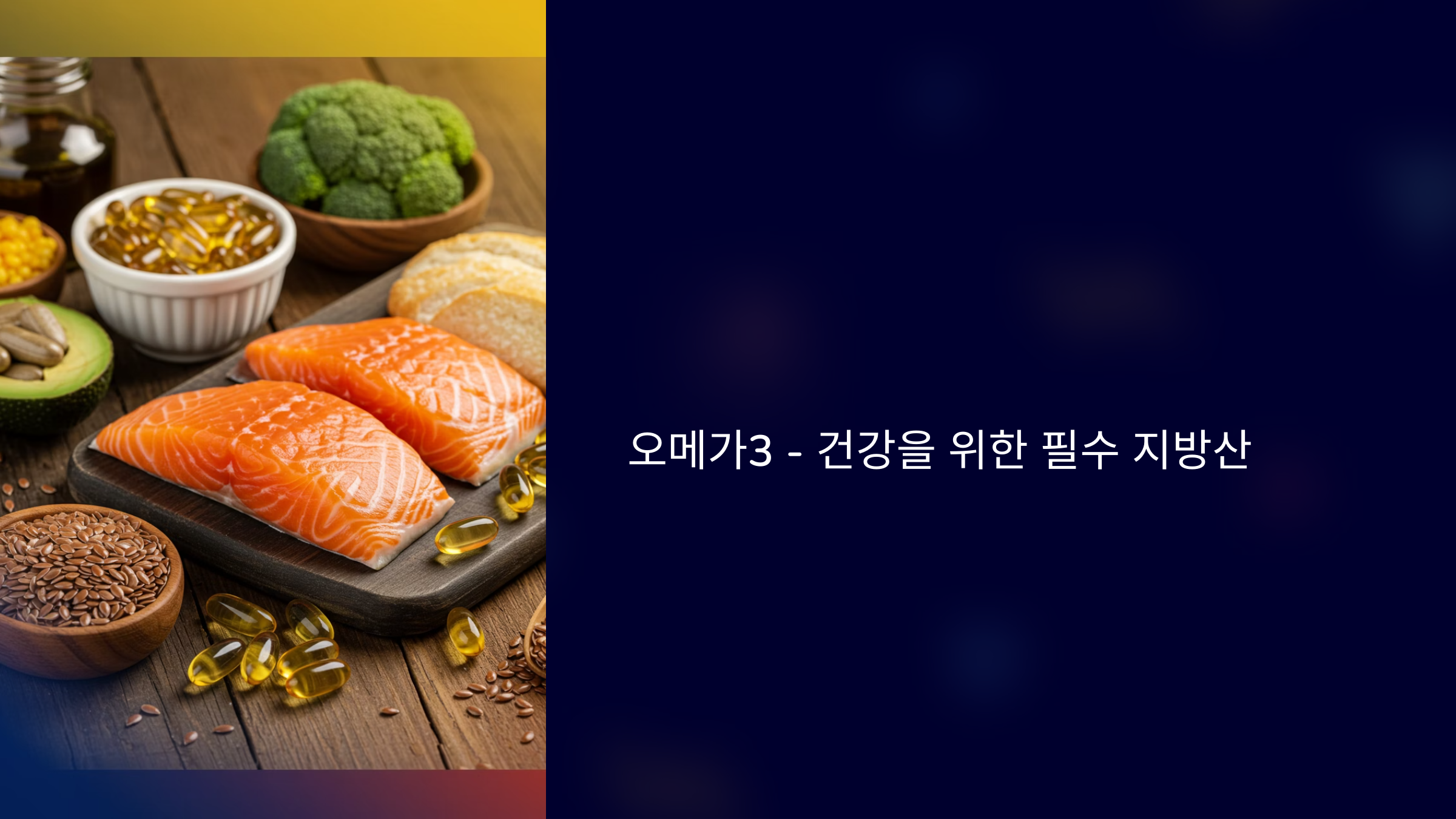 오메가3는 인체에서 합성되지 않는 필수지방산으로, 음식이나 보충제를 통해 섭취해야 합니다. 주요 성분으로는 EPA(에이코사펜타엔산), DHA(도코사헥사엔산), ALA(알파 리놀렌산)이 있으며, 심장과 두뇌 건강, 눈의 건조감 완화에 도움을 줍니다.