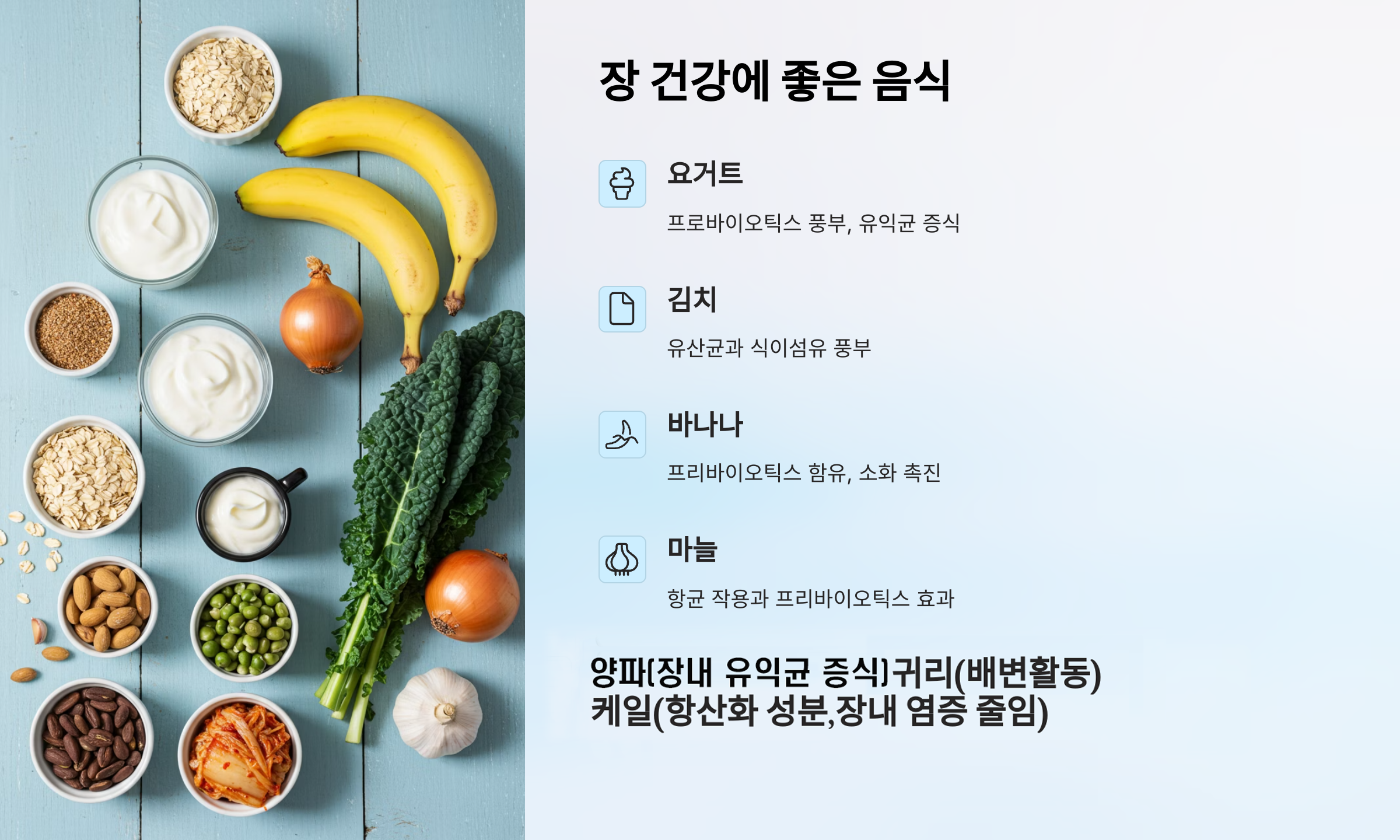 프로바이오틱스가 풍부한 대표 식품으로, 장내 유익균을 늘리고 유해균을 억제하는 데 효과적입니다.