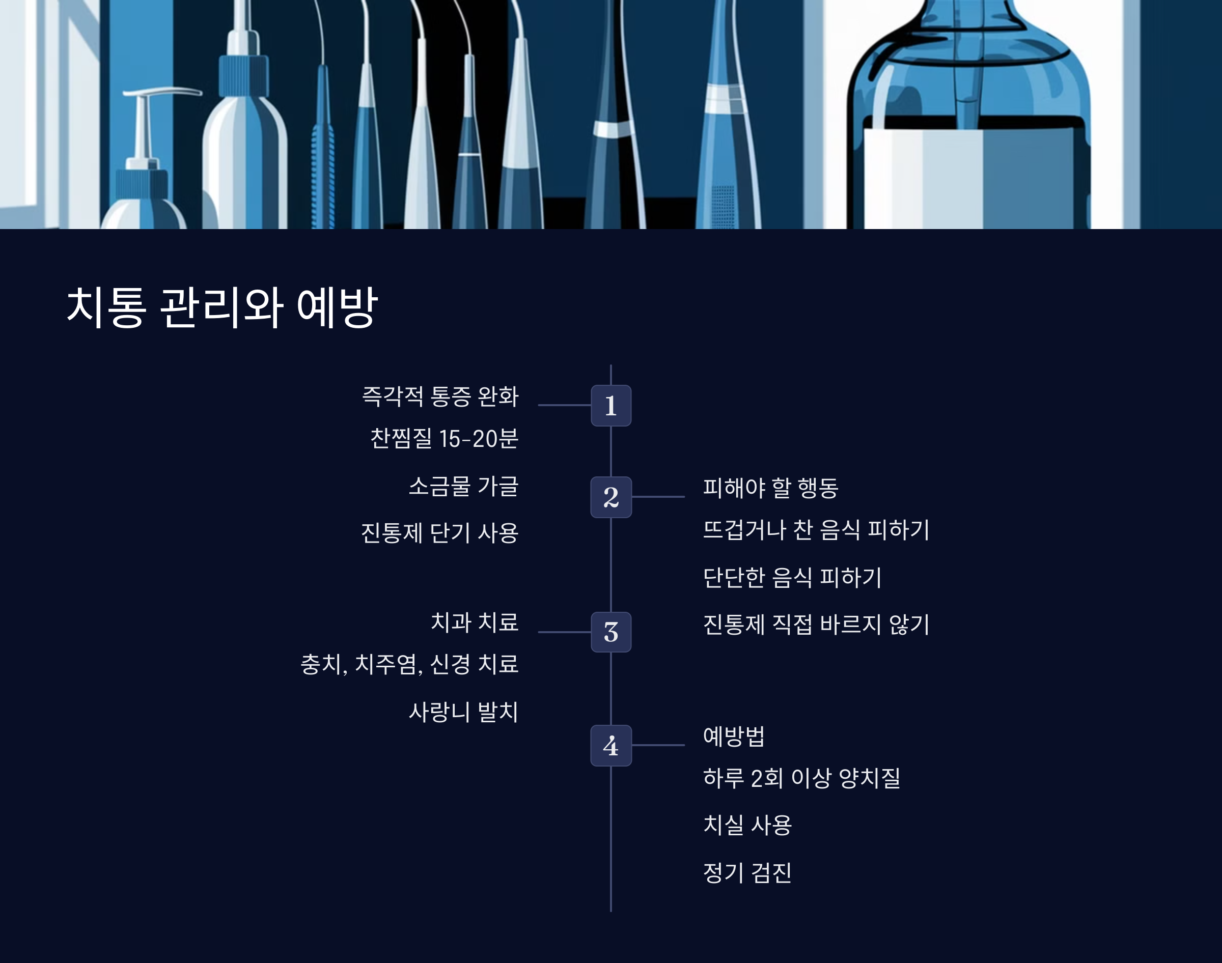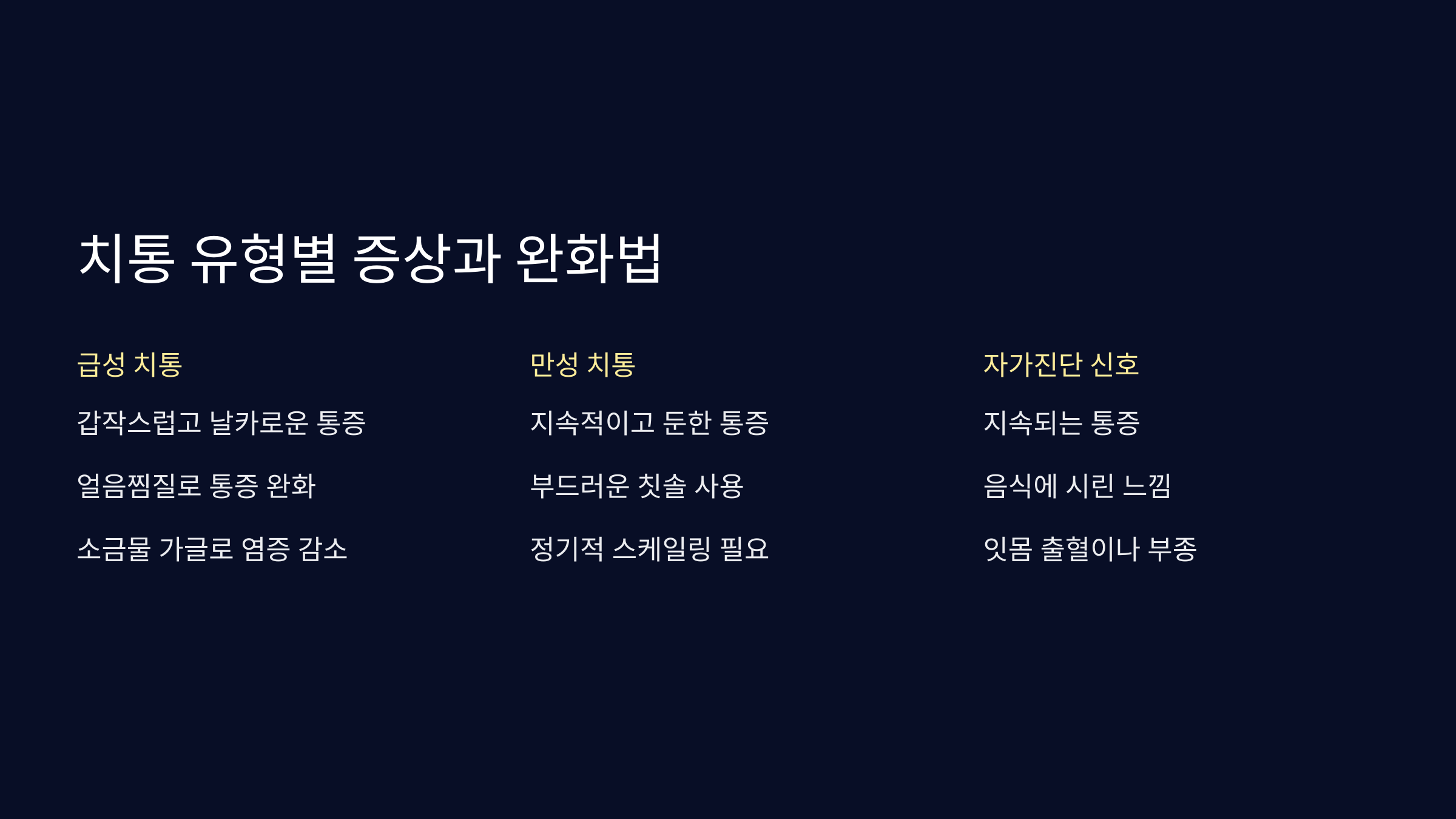 - 통증이 가라앉더라도 반드시 치과에 방문해 근본 원인 치료 필요