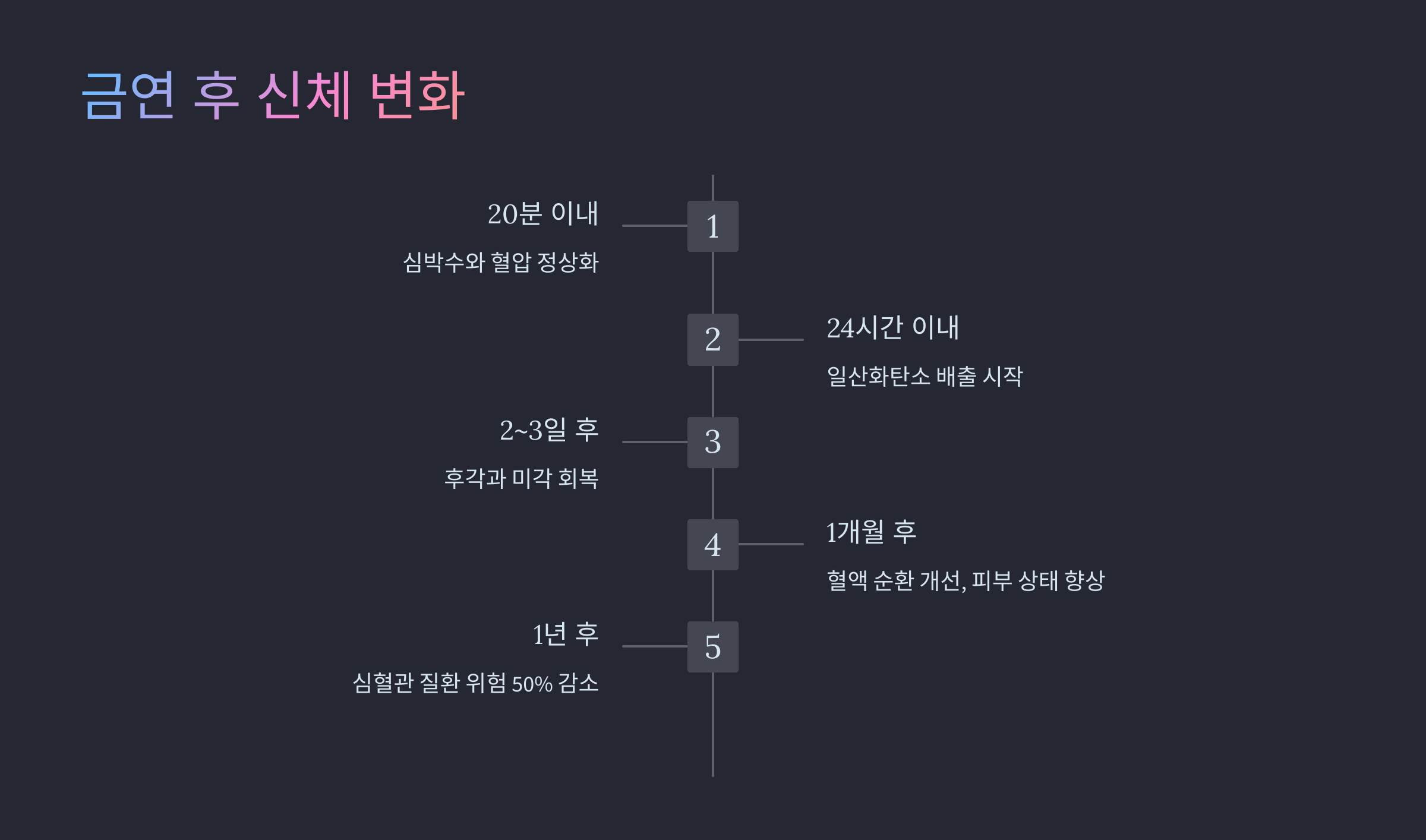 금연 후에 신체에서 일어나는 변화는 다양한 단계로 진행되며, 시간이 지남에 따라 점차적인 회복이 이루어집니다. 각 단계별 신체 변화를 살펴보면 금연이 건강에 미치는 긍정적인 영향을 더 잘 이해할 수 있습니다.