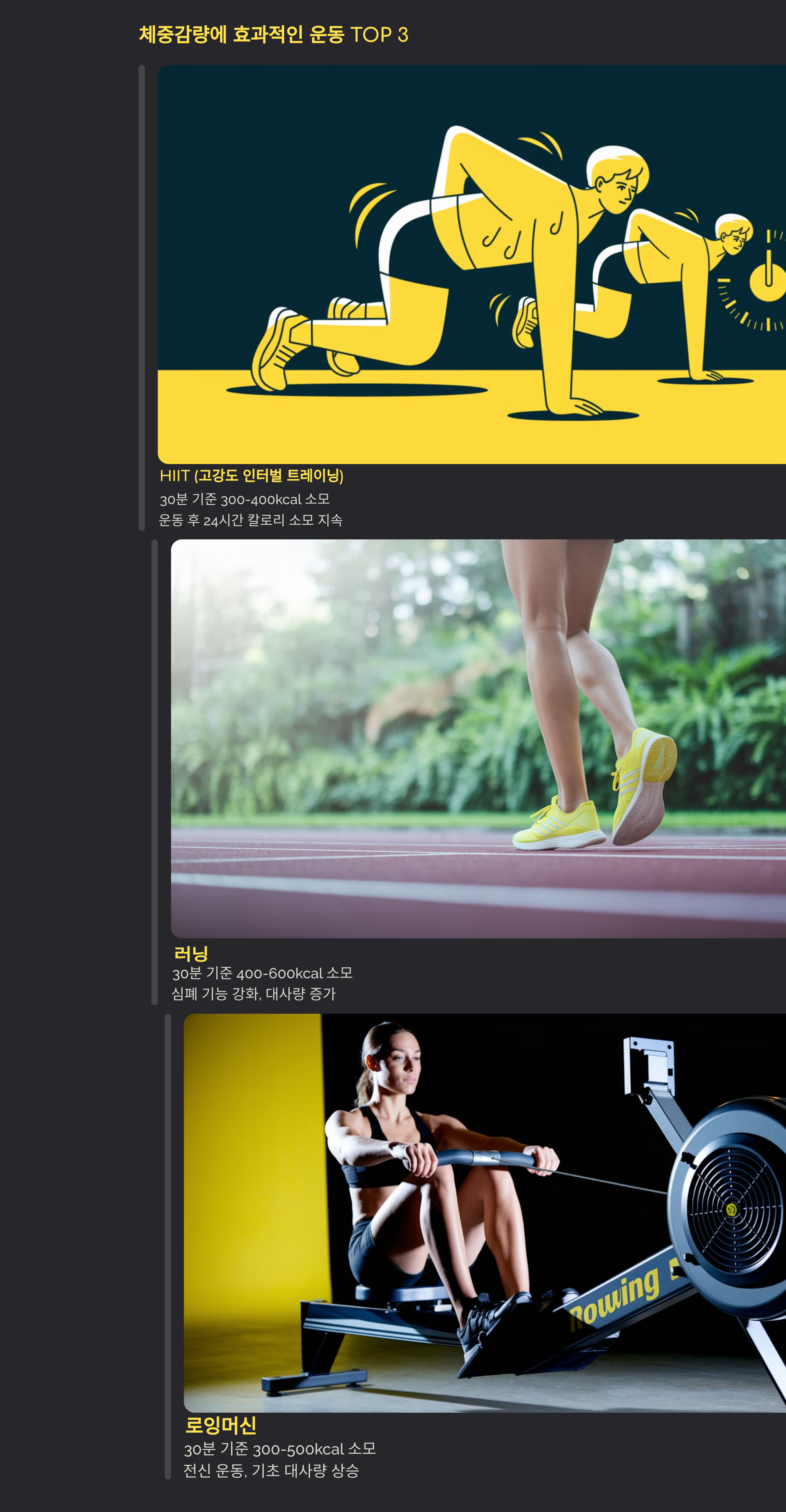 - 유산소 운동: 인터벌 트레이닝, 수영, 러닝